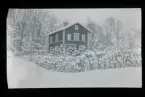 Här är skogvaktarbostaden som familjen Brundin hyrde av Stora Kopparbergs Bergslag. Familjen Brundin och familjen Lundberg, arrendatorsfamiljen, som bodde närmaste granne. Till vänster om David Brundin i hatt står hembiträdet Gertrud.