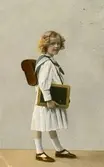 Poträttfotografin förställer Heide Lembke som skolbarn. Hon är klädd i en vinterkappan, mössa, lädersko och randiga strumpor. På ryggen bär hon en skolväska och runt halsen en väska för matsäcken.