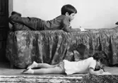 A G Borg sitter vid skrivbordet och "Tilan" Borg står bredvid med ett papper i handen, Sanda, Harg socken, Uppland