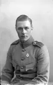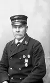 Torsten Fält med skyttrock och mössa, skyttemärken och medaljer.