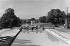 Ett fartyg vid sluss i Sjötorp längs Göta kanal. En ledfyr till höger i bild.