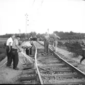 Järnvägsolycka 2 km söder om Ekets stations Eket SSJ. Uppgående morgontågets lok och nio vagnar spårade ur på grund av solkurva. SSJ , Skåne - Smålands Järnväg. SSJ 301