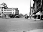 Skioptikonbild från institutionen för fotografi vid Kungliga Tekniska Högskolan. Använd av professor Helmer Bäckström som undervisningsmaterial. Bäckström var Sveriges förste professor i fotografi vid Kungliga Tekniska Högskolan 1948-1958. Spårvagnsspår.