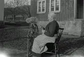 "Anna-Lena spinner linblånor". Äldre kvinna sitter på gården och spinner lingarn.