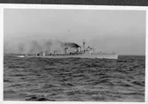 Flygfoto visande: En kryssare av Tre Kronor-klass, en äldre stadsjagare, en nyare stadsjagare av Visby-klass samt tre ubåtar.