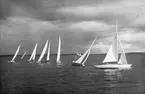 Från Höstseglingarna i Saltsjöbaden 1946, enmansseglingen 14 september. Starbåt 2126 STARDUST ses i förgrunden t h, de andra båtarna på bilden är fr v t h starbåt 904 VÄSTAN, folkbåt F-S120 EJDERN (b. 1946, konstr. Tord Sundén) samt starbåtarna HUX-FLUX II, 1804 SEA STAR, 860 TORPÃN och 1798 LOTTA IV. I bakgrunden t h ses 5m-jakten 5-S85 SPINDRIFT (b. 1945, konstr. Jac. M. Iversen).