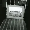 Taburett. Gavelsidorna snidade i samma slags plattskärning som soffa och stolar. Numera vitmålad och klädd med rött, mönstrat ylle. Två st i salen.