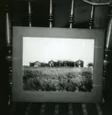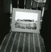 Stol. Frambenen nertill rundsvarvade. Fast stoppning i sitsen o. å ryggbrickan. Numera vit o. klädd med rött, mönstrat ylle. 6 st. (Salen).