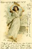 Beställare Elisabeth Selander. S. Vallgatan 15. Kvinnor i scenkläder bestående av vida byxor med hög midja, vit skjorta, kort väst och vidbrättad svart hatt. Ur Walter Olsons negativsamling.