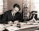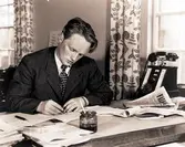 "Tidningen går i press". Tryckare Bror Bernsand (Falköpings tidning). Från utställningen "Falköping i bild" 1952.