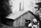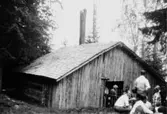 Timmerkoja i skog med snedtak och murad skorsten. Fem män i uniform.