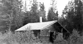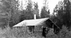 Påskrift: "Holmboms koja i Tarradalen". Man med pipa i munnen utanför timmerkoja.