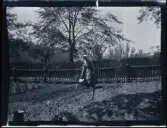 Möjligen grevinnan Augusta Thott, f. Hallenborg (1857-1936), gift med greve Otto Thott, 1854-1933, fideikommisarie till Skabersjö, Grevinnan omges här av tjänstefolk.