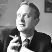 Carl Gösta Jackson (till höger) tillbringar en fikapaus med en cigarette i handen tillsammans med en oidentifierad vän. 1940/50-tal.