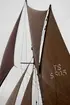 Här visas en storbåt eller tremänning upp vid Hörte fiskeläge, som ligger i Burs och inte på När. Som synes är den betydligt större än fisbåten på Nr 390. Den har 4 årtullar och seglades med tre master med sprisegel, alltså ett på höjden rektangulärt segel som hölls uppe med en diagonal s k spristake. Man kunde också ha små toppsegel. På den främre masten hade man trekantiga segel fram mot stäven, den närmast masten hette fock och den yttre hette klyvare.