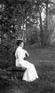 Maj Berggren sitter på en trädgårdsstol med en katt i famnen