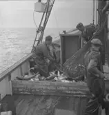 'Ombord på''Skagerack''. :: :: Närbild på en trål då vattnet rinner ut på däck. :: Ingår i serie fotonr. 4776:1-13'