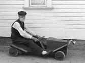Hittegodset 31 mars 1966 En ung man klädd i vit skjorta, mörk slips, mörka byxor, mörk tröja, mörka skor samt med glasögon sitter på en stor trampbil inne på Polisens Hittegodsavdelning. I bakgrunden hänger cyklar upphängda samt två vagnar står uppställda mot väggen i bakgrunden. or. Han går nedför en kort trappa utomhus.