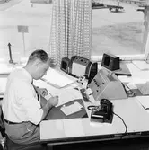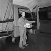 Transiterade postpaket lagras, i väntan på tåglägenhet, utanför transportavdelningen. Personalkonsulent Claes Ringqvist, postdirektionen i Stockholms D., stuvar.