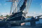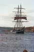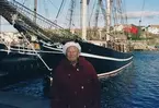 Tvåmastad slätskonare, troligen Ägil ex Sleipner, regnr 3035, med stor flaggning, i Uddevalla hamn. Briggen Emil i bakgrunden."