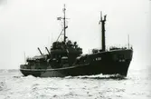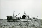 Utsjöankringsmaterial för ubåtsbärgning tas ombord på Belos. Ankare lyfts ombord med kran.