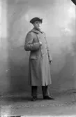 En ung man, klädd i uniformsrock och hjälm, står vid ett eldvapen med händerna på en vev.