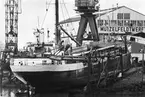 Småland, Kalmar län, Södra Möre härad, Söderåkra socken, Djursvik. Fredrik Jonssons varv. Båtbyggnadsskjul. I bakgrunden ett vrak för upphuggning
