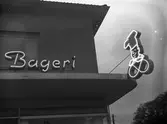 Stadsbild från Mönsterås. Till vänster syns E. Burströms klädes, kapp- och manufakturaffär.