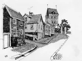 Man på promenad söderut på Upplandsgatan. Till vänster delar av kvarteret Bergslagen under rivning.