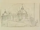 A T Gellerstedts akvareller, tillfällig utställning på Nordiska museet 7 april 2001. Teckning från 1890. Blecktornet, Söder Stackgatan och Ekensberg 23/3 1890.