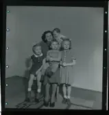 Medföljande vuxna vid Brattåsskolan åk 6 elevers lägerskola, Ransbergs Herrgård i Värmland 1975. Från vänster: 1. Okänd man. 2. Else Britt Nilsson, förälder. 3. Tomas Bergström, lärare. 4. Okänd man. 5. Berit Brännström, förälder. Relaterade motiv: A4633 - A4637.