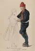 "Karl och qvinnodrägt, Ljusdahl 1840" Blyerstskissad kivnna och akvarellerad man som dansar. Akvarell av J.W Wallander.
