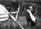 Pigorna Beda Lundgren och Agnes Andersson klipper fåren i Nils-Nils. Foto 1917-1918.