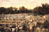 "Laxgård och hängbro i Uddaveka på 1920-talet." I förgrunden sitter en kvinna i stor hatt i en eka vid åstranden.