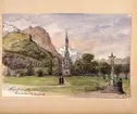 "La chapelle des Rosaires. Lourdes 13 april 86." Ett kapell utanför staden Lourdes i södra Frankrike. Akvarell av Fritz von Dardel, 1886