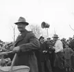 Skogsdag Örserums brunn 1961. En man står och håller upp en megafon framför ansiktet. Han håller en pipa i handen. Bakom honom finns en stapel med plank.