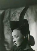 "Rose Valois, mellanbrun färg". Modell, möjligen Hjördis Grundel-Starenius, klädd i hatt. Hög kulle, utan brätte, fjäder, flor. Hatten bärs mitt på huvudet.