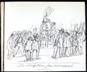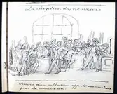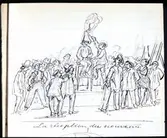 "La réception du nouveau". Invigningsritual bland studenter i Léon Cogniets konstskola, Paris. Tuschteckning av Fritz von Dardel, 1840.