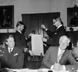 Sittande till höger är riksmarskalken, amiral Stig H:son Ericson, dopförrättare av torpedbåten Västervik. Stående är generaldirektören för försvarets materielverk, generallöjtnant Ove Ljung.