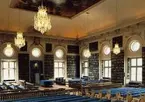 Lantmarskalkssalen i Riddarhuset med ett långt bord och stolar. På väggarna porträtt i förgyllda ramar.