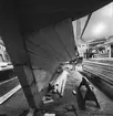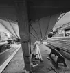 Kungsträdgården. Damm med små fontäner i parkens norra del. Turistbyrå i kv. Sju Sekel. Vy mot Nordiska Kompaniet.
