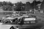 Dräkt. Handarbetande kvinna i helfigur sittande framför ett skåp. Akvarell i storformat föreställande av A.J.G Virgin