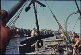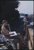 Folk som tittar på båtar i Karl Johansslussen. Vid räcke ovanför. Vy mot Riddarfjärden.